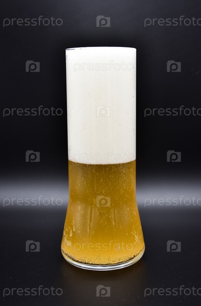 Стеклянная колба на черном фоне с желтой жидкостью и белой пеной, стакан пива на черном фоне