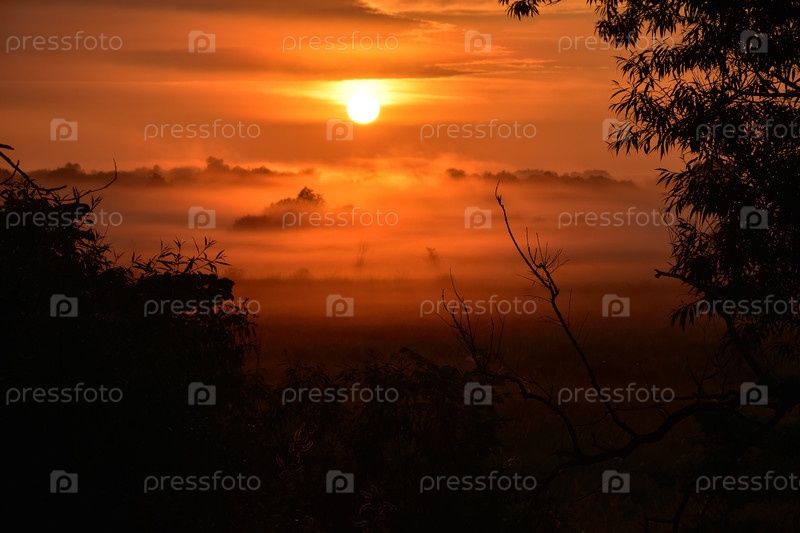 Оранжевый восход солнца с туманами в лесу. силуэты деревьев на рассвете
