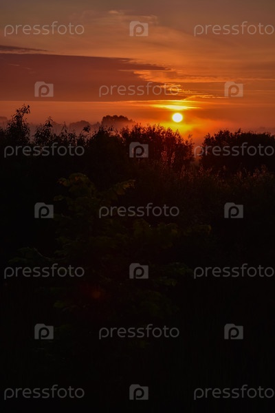 Оранжевый восход солнца с туманами в лесу. силуэты деревьев на рассвете