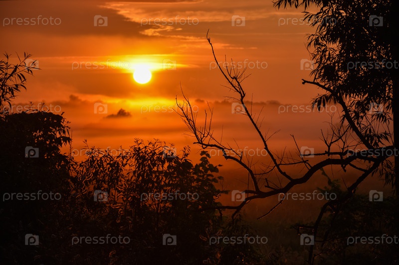 Оранжевый восход солнца с туманами в лесу. силуэты деревьев на рассвете