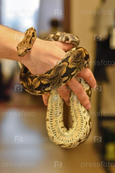 Питон в руке, змея в руке, мужчина держит питона