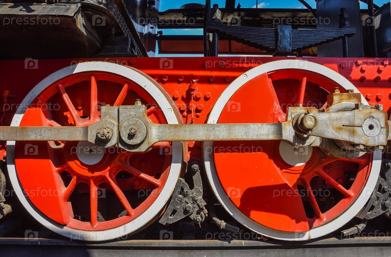 Красные колеса паровоза, металлические колеса старого паровоза
