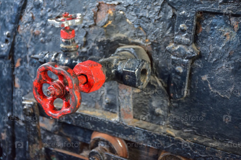 Ржавый клапан в паровозе, красный кран клапана крупным планом