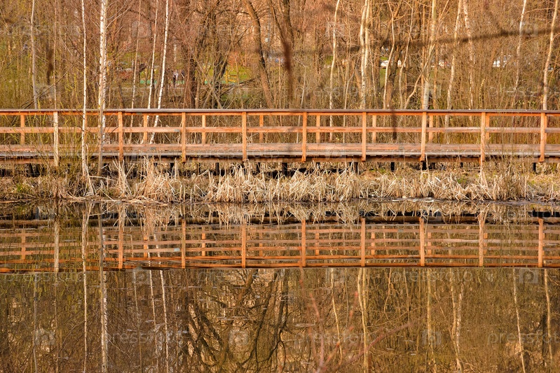 Отражение деревянного моста в реке