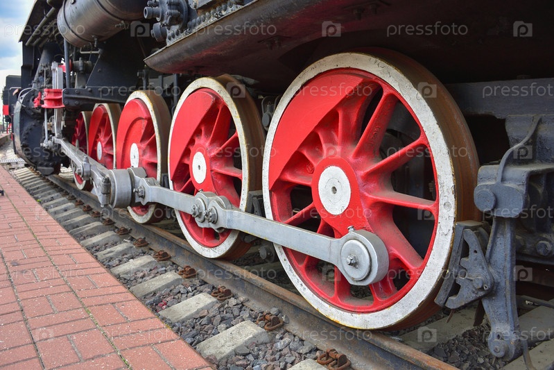 Красные металлические колеса, два колеса паровоза