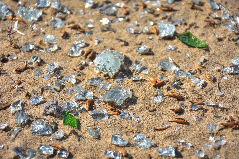 Осколки стекла крупным планом на песке