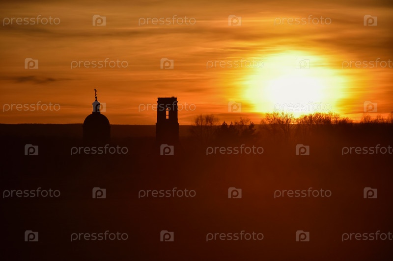 Силуэт церкви на фоне заката, заброшенная церковь в поле на закате, церковь на красочном закатном небе