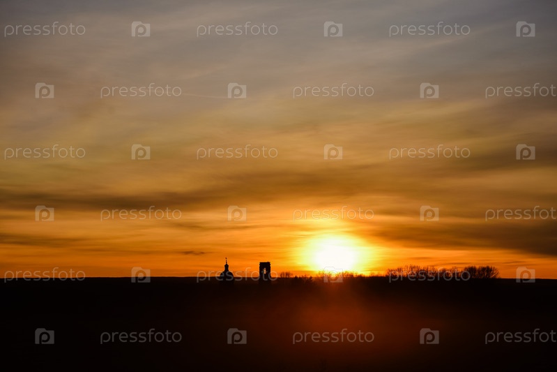 Силуэт церкви на фоне заката, заброшенная церковь в поле на закате, церковь на красочном закатном небе