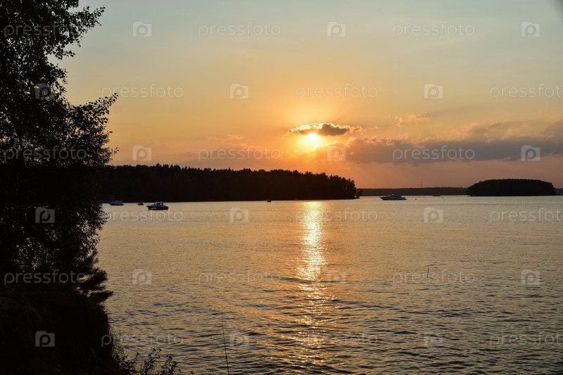 Закат на озере, силуэт березы на фоне заката
