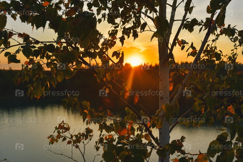 Дерево на фоне заката, заходящее солнце сквозь деревья
