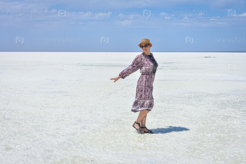 Женщина в платье на белом соленом озере, портрет женщины на белом соленом озере