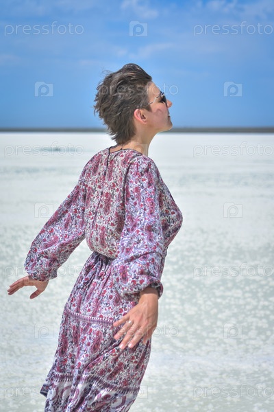 Женщина в платье на белом соленом озере, портрет женщины на белом соленом озере