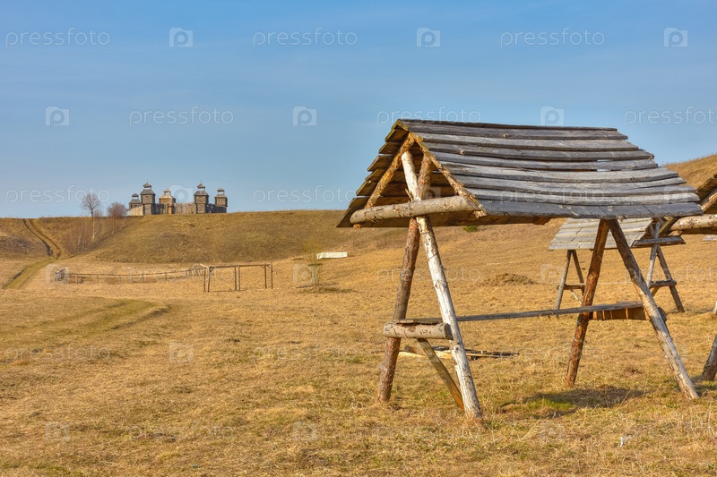 Деревянная крепость в поле, древнерусское деревянное строение, деревенская башня в поле