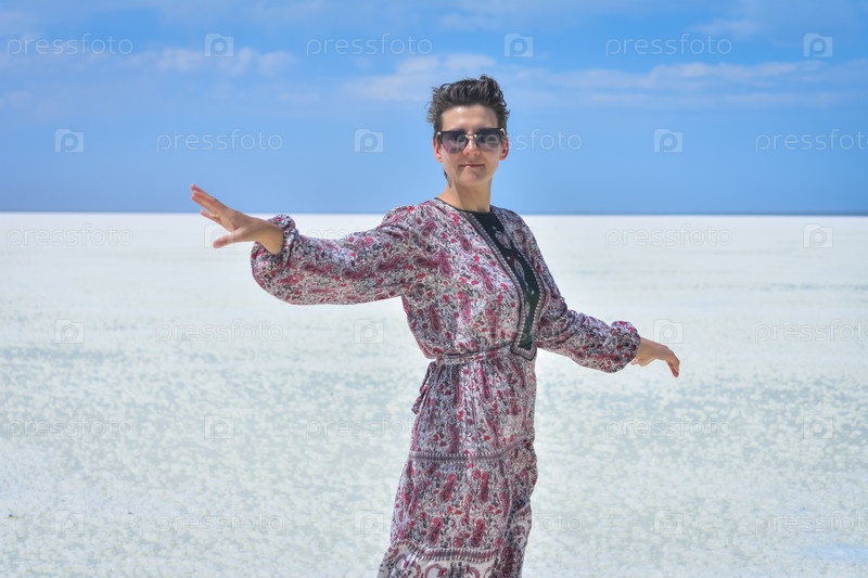 Женщина в платье на белом соленом озере, портрет женщины на белом соленом озере