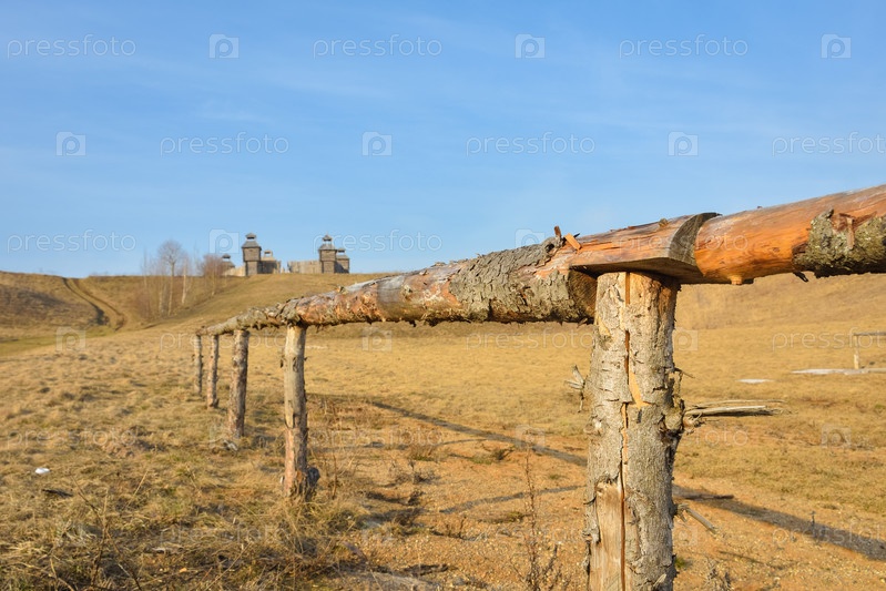 Деревянная крепость в поле, древнерусское деревянное строение, деревенская башня в поле
