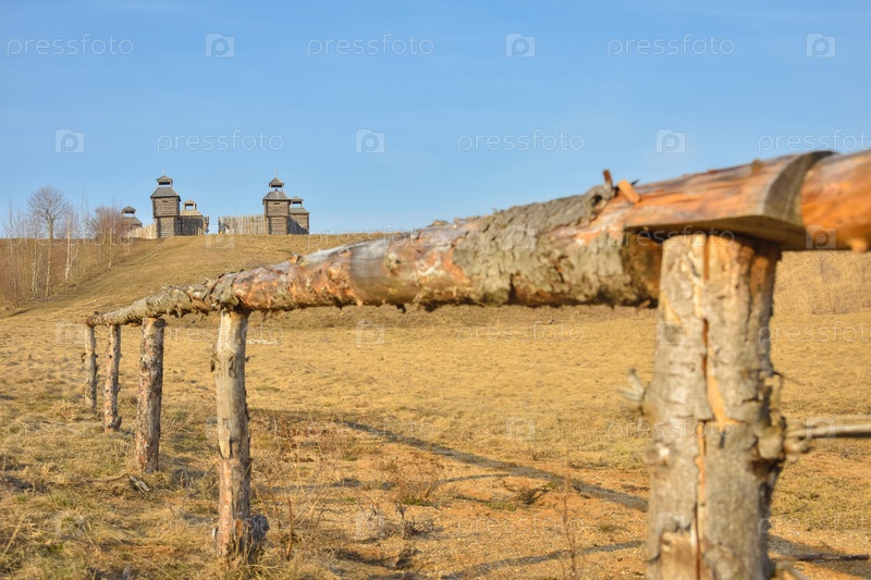 Деревянная крепость в поле, древнерусское деревянное строение, деревенская башня в поле