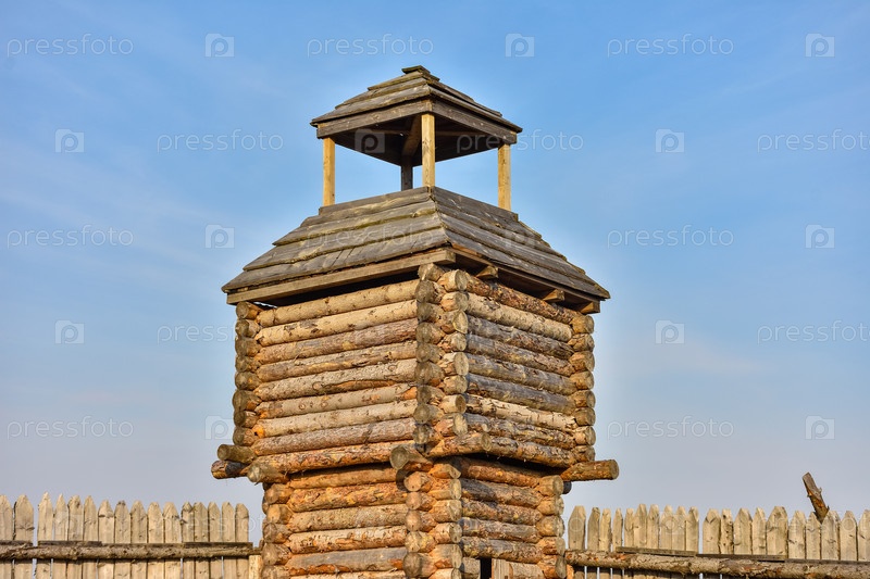 Деревянная крепость в поле, древнерусское деревянное строение, деревенская башня в поле