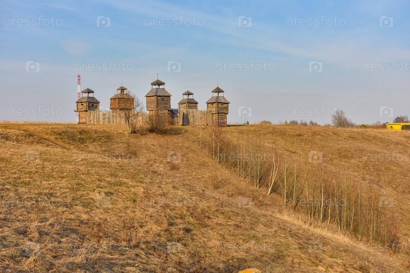 Деревянная крепость в поле, древнерусское деревянное строение, деревенская башня в поле