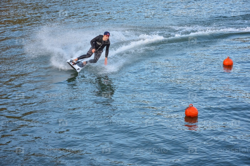 Участник Motosurf вступает в поворот при скорости, образуя много распылений. реактивный серфинг на воде, мужчина катается на реактивной доске для сёрфинга. серфер в движении, летний спорт
