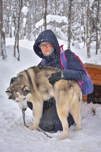 Женщина в очках позирует с хаски в заснеженном лесу