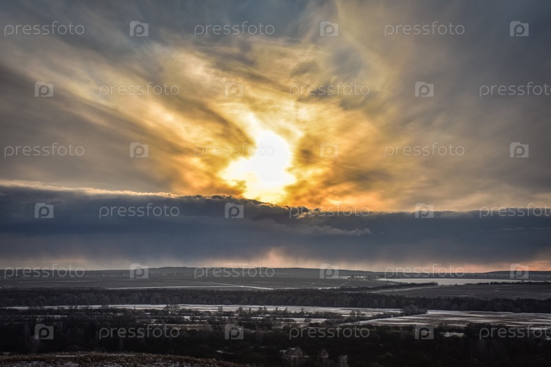 Красочный закат в поле, зимний закат, оранжевый яркий закат в зимнем поле