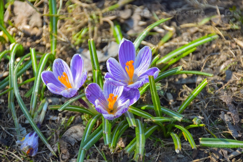 Три фиолетовых весенних крокуса, растущих в траве крупным планом