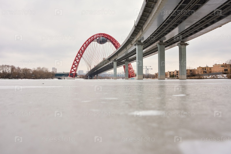Вид на автомобильный мост с красной аркой, живописный мост через Москву-реку