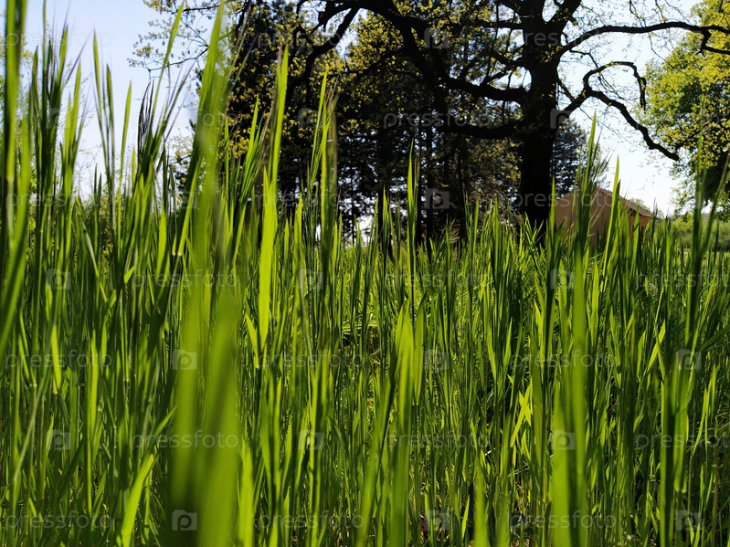 Зеленая предпосылка травы с лучом солнца. Пшеничное поле. Взошли посевы озимых культур. Весна или лето. Частично расфокусированное горизонтальное фото