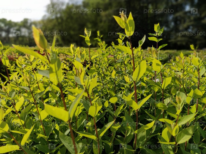 Зеленые растения крупным планом с подсветкой. Озеленение в городском парке. Частично расфокусирован