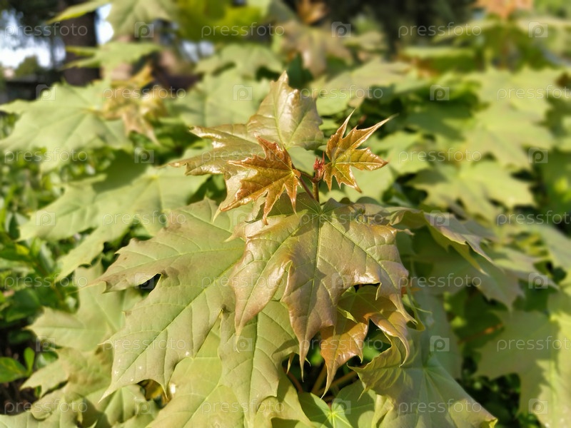 Зеленые кленовые листья фон. Свежие яркие ростки клена