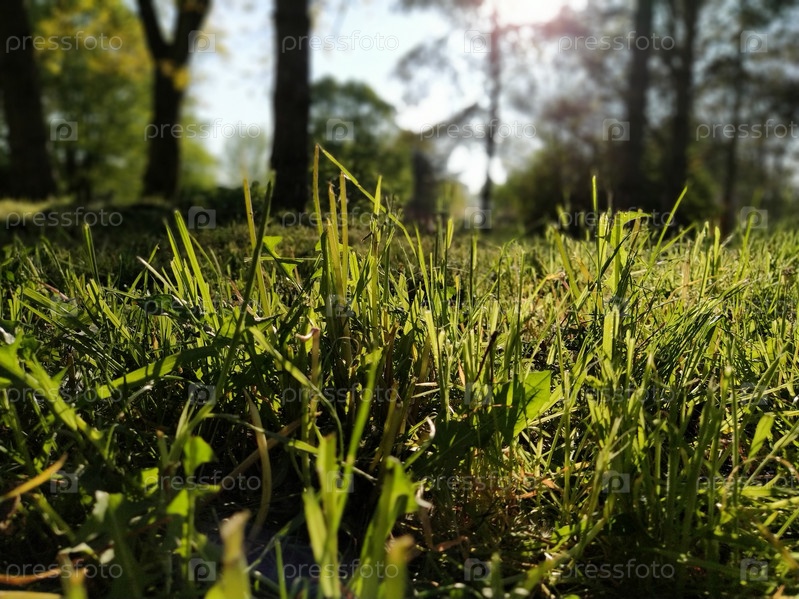 Зеленая трава на лугу. Лужайка в городском парке с подстриженной травой. Солнечные лучи и блики. Горизонтальная фотография. Лес весной или летом. Концепция экологии. Размытое боке