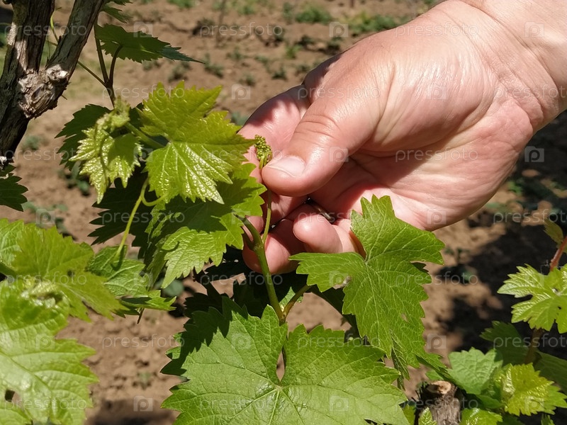 Крупный план рук виноторговца или виноградаря, осматривающего урожай винограда. Мужские руки и виноградная лоза. Молодые побеги винограда с соцветиями и небольшими завязями винограда. Будущий урожай вина