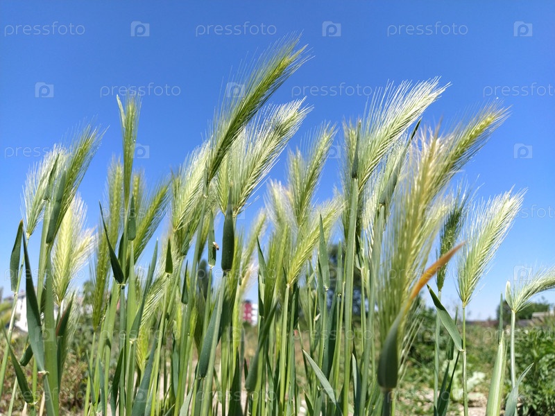 Колосья злаковых растений на поле на фоне голубого неба. Пшеничный или ржаной с пушистыми метелками. На заднем плане безоблачное небо и городские дома. Концепция экологии и красивой природы