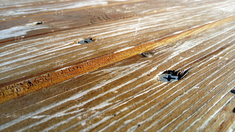 Текстура дерева. Деревянная скамейка. Трещины на бревне. Изделие из досок. Свежая древесина светлого цвета. Два винта вкручены в плату