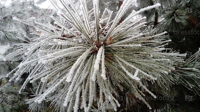 Красивые длинные сосновые иглы с белым инеем. Замороженные ветки вечнозеленого растения. Деревья замерзли в страшный мороз. Кристаллы льда образуются из-за высокой влажности