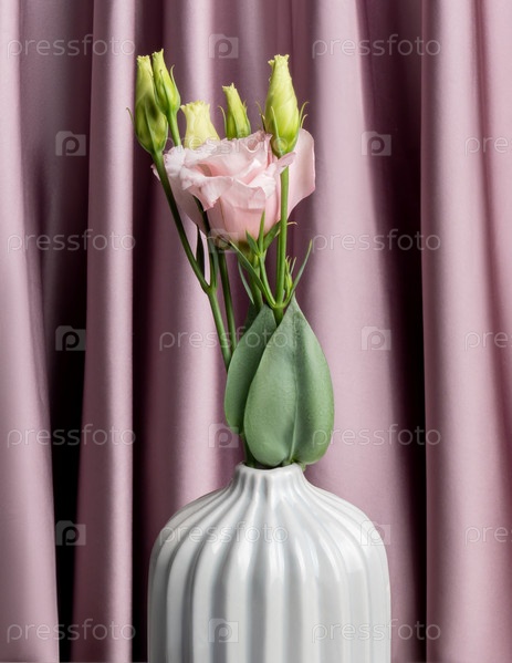 Крупный план розовых цветов эустомы в керамической вазе на текстильном фоне. Цветочная композиция, украшение интерьера