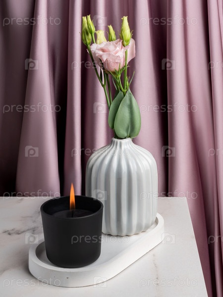 Горящая свеча на мраморном столе рядом с вазой с цветами эустомы. Дизайн интерьера. Уютный стиль
