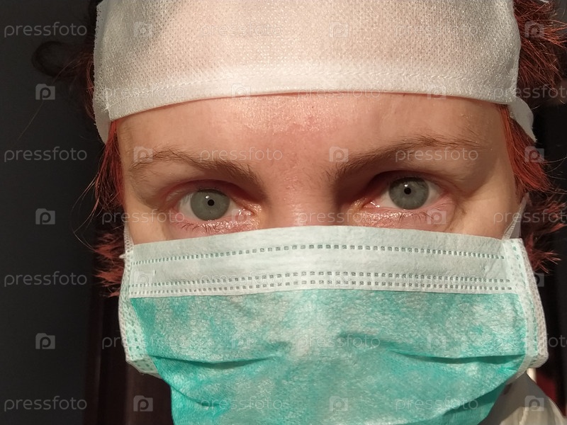 Рыжая женщина с больными уставшими глазами в защитной хирургической маске зеленого цвета. Серые глаза и рыжие волосы. Темный фон. Меры защиты от вирусных и бактериальных заболеваний. Тревожный вид