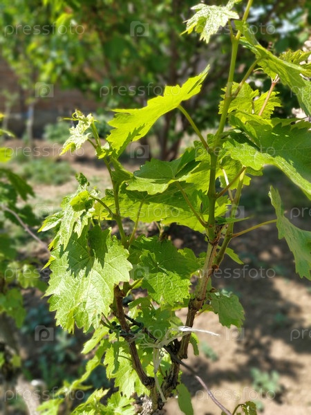 Виноград с молодыми листьями. Закрыть. Молодая лоза привязана к деревянной колонке