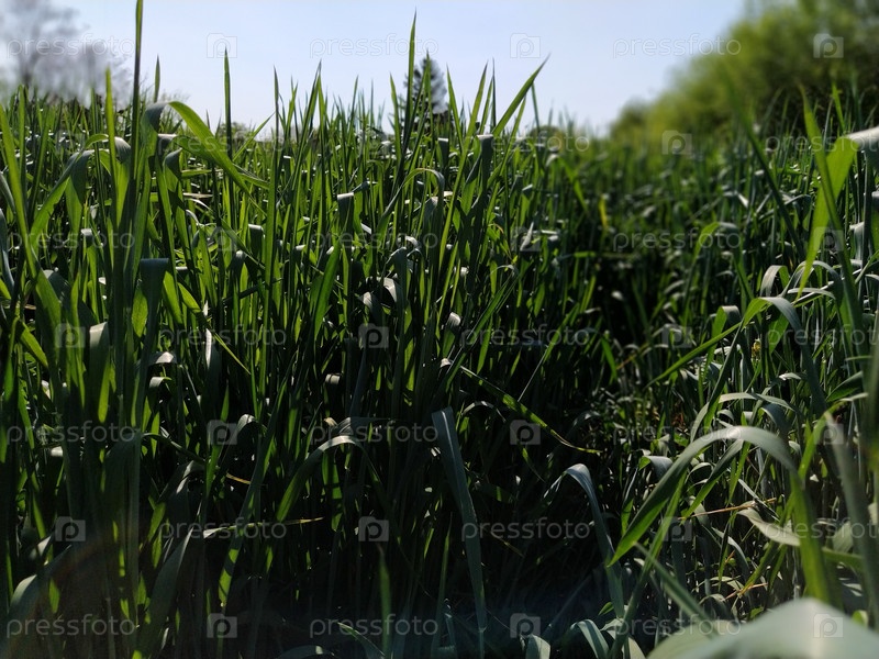 Пшеничное поле крупным планом. Летом зеленая высокая трава колышется и качается на ветру. Насыщенный зеленый цвет. Расфокусированный фон. Мягкий фокус