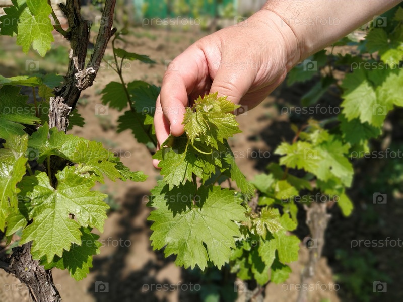 Крупный план рук виноторговца или виноградаря, осматривающего урожай винограда. Мужские руки и виноградная лоза. Молодые побеги винограда с соцветиями и небольшими завязями винограда. Будущий урожай вина