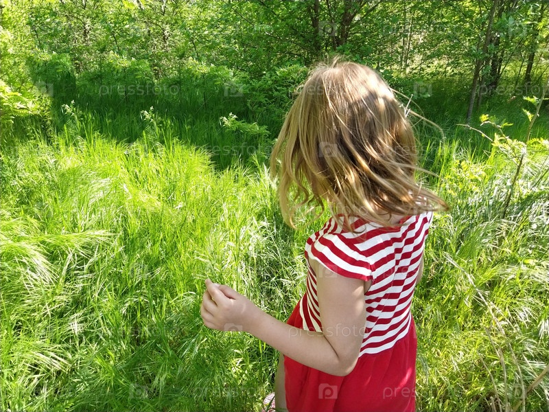 Девушка спиной на фоне зеленой травы. Ребенок со светлыми волосами и в красном платье. Девушка гуляет по лесу со свежей зеленой травой. Распущенные светлые волосы развеваются на ветру. Момент движения