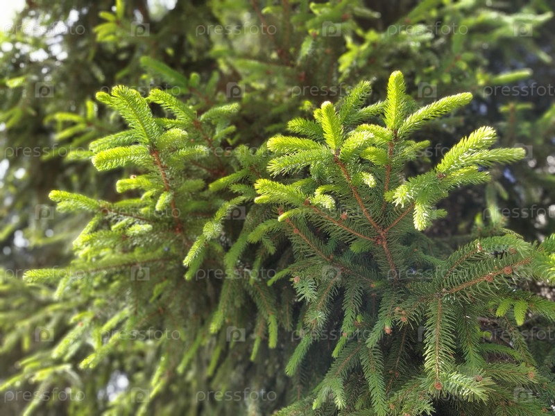 Красивые блестящие еловые ветки. Естественный фон. Тонкая хвойная хвоя. Фон из веток елки. Частично расфокусирован