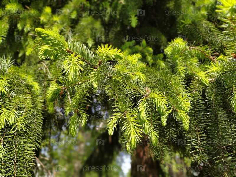 Красивые блестящие еловые ветки. Естественный фон. Тонкая хвойная хвоя. Фон из веток елки. расфокусированный