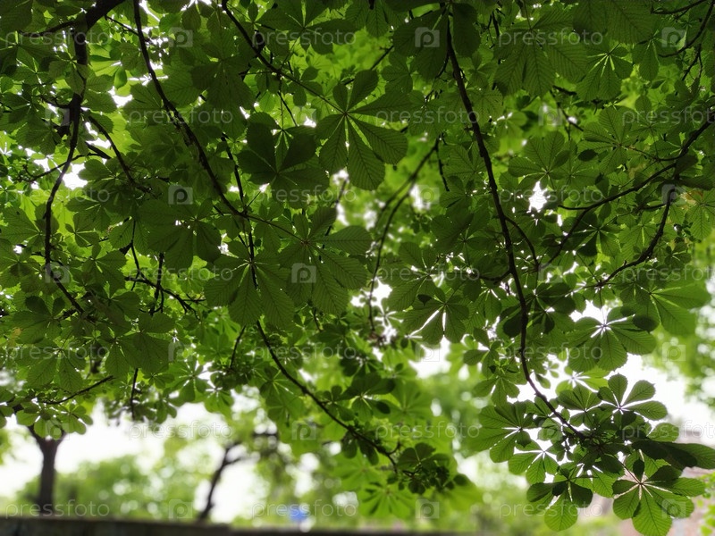 Новые листья на конском каштане. Каштаны, ветки и листья в лесу, сфотографированные снизу с подсветкой. Красивый растительный фон