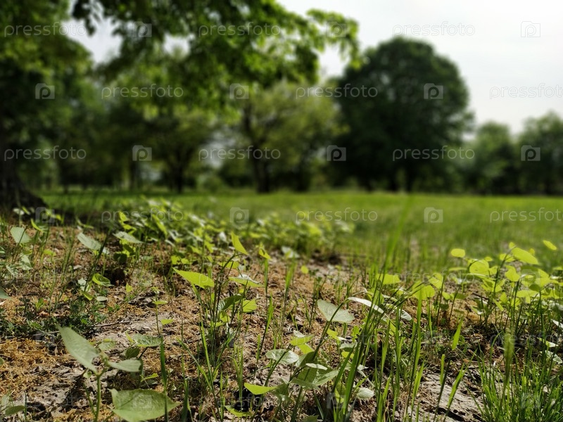 Молодые растения липы. Фото сделано с уровня земли. Размытое боке для художественного эффекта. Концепция перерождения жизни, кармы, перерождения, смены поколений