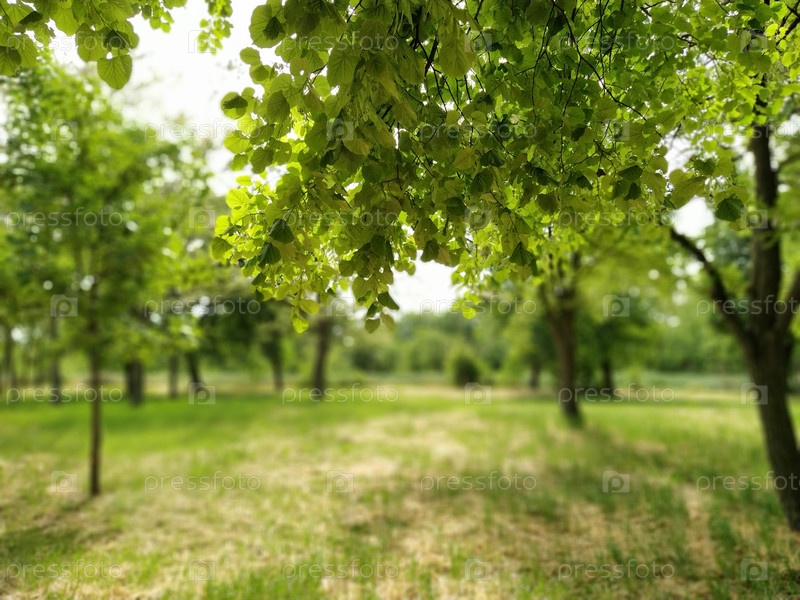 Красивый лиственный лес. Ароматные цветы липы. Фотография сделана из-под большой ветки липы. Ярко-зеленая листва. Размытое боке на заднем плане