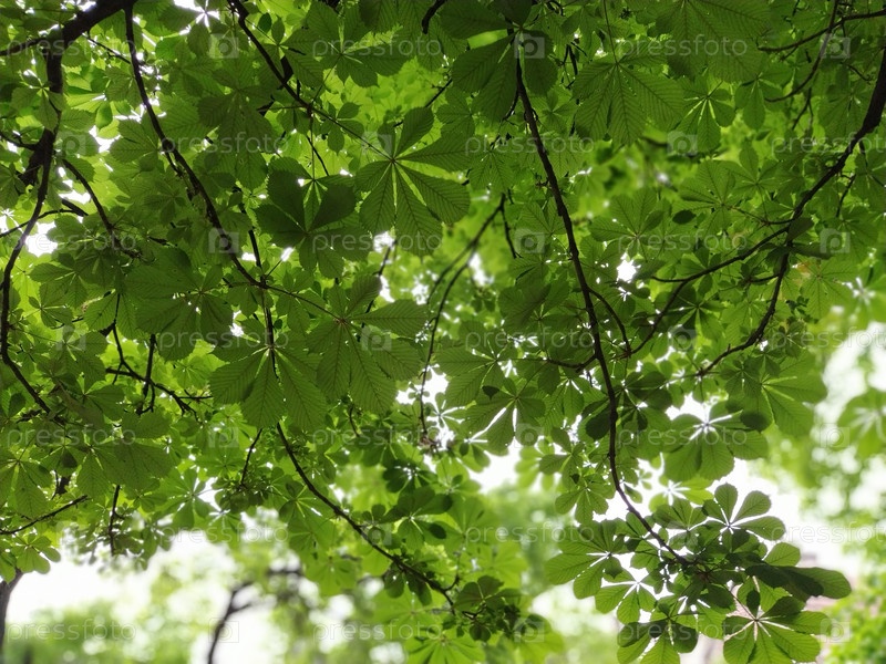 Новые листья на конском каштане. Каштаны, ветки и листья в лесу, сфотографированные снизу с подсветкой. Красивый растительный фон