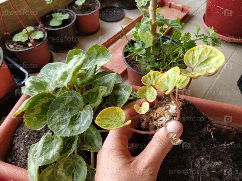 Пересадка цикламена в домашних условиях. Женские руки работают с почвой, инструментами и цветочными горшками. Весенние работы на балконе или террасе. Домашнее цветоводство и растениеводство. Зеленые листья, корни и клубни цикламена
