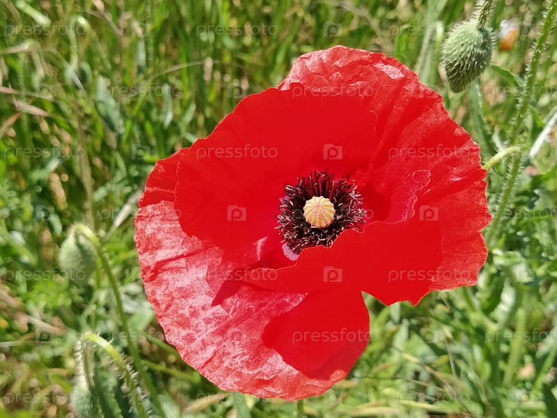 Красивый красный мак крупным планом. Весенний или летний цветок яркой окраски с тычинками, пестиками. Лепесток переливается на солнце